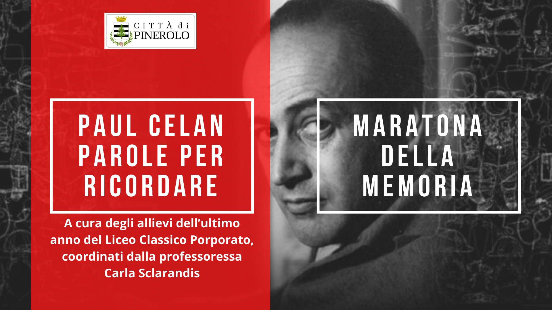 - ore 16,00 Paul Celan. Parole per ricordare – video realizzato dagli allievi dell’ultimo anno del Liceo Classico Porporato. I lavori degli allievi sono stati seguiti dalla professoressa Carla Sclarandis