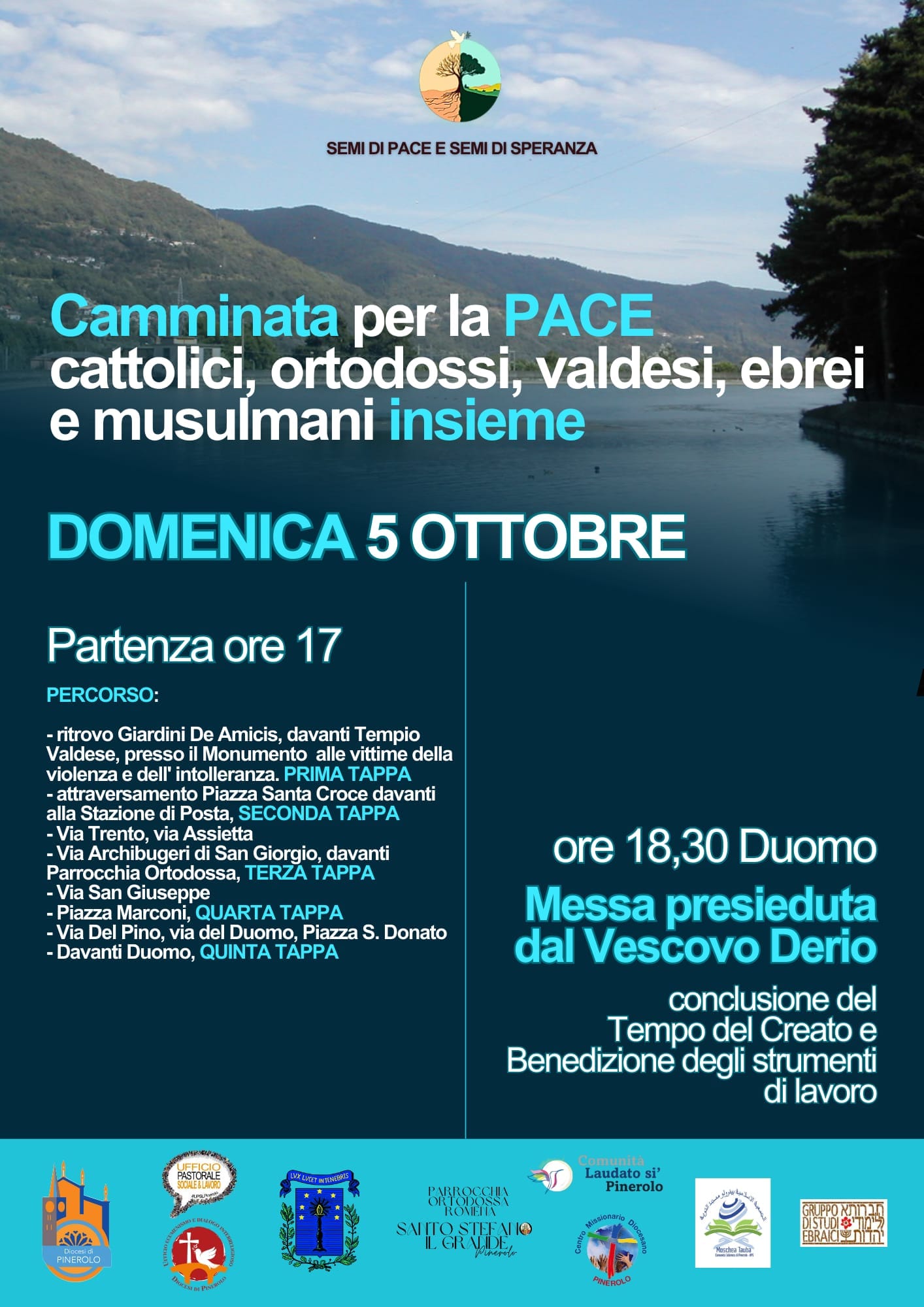 Nell’ambito del progetto “Semi di pace e di speranza”, domenica 5 ottobre alle ore 17 a Pinerolo si terrà una camminata per la pace. L’iniziativa vedrà la partecipazione di fedeli cattolici, ortodossi, valdesi, ebrei e musulmani, in un momento di condivisione e fraternità aperto a tutta la cittadinanza.