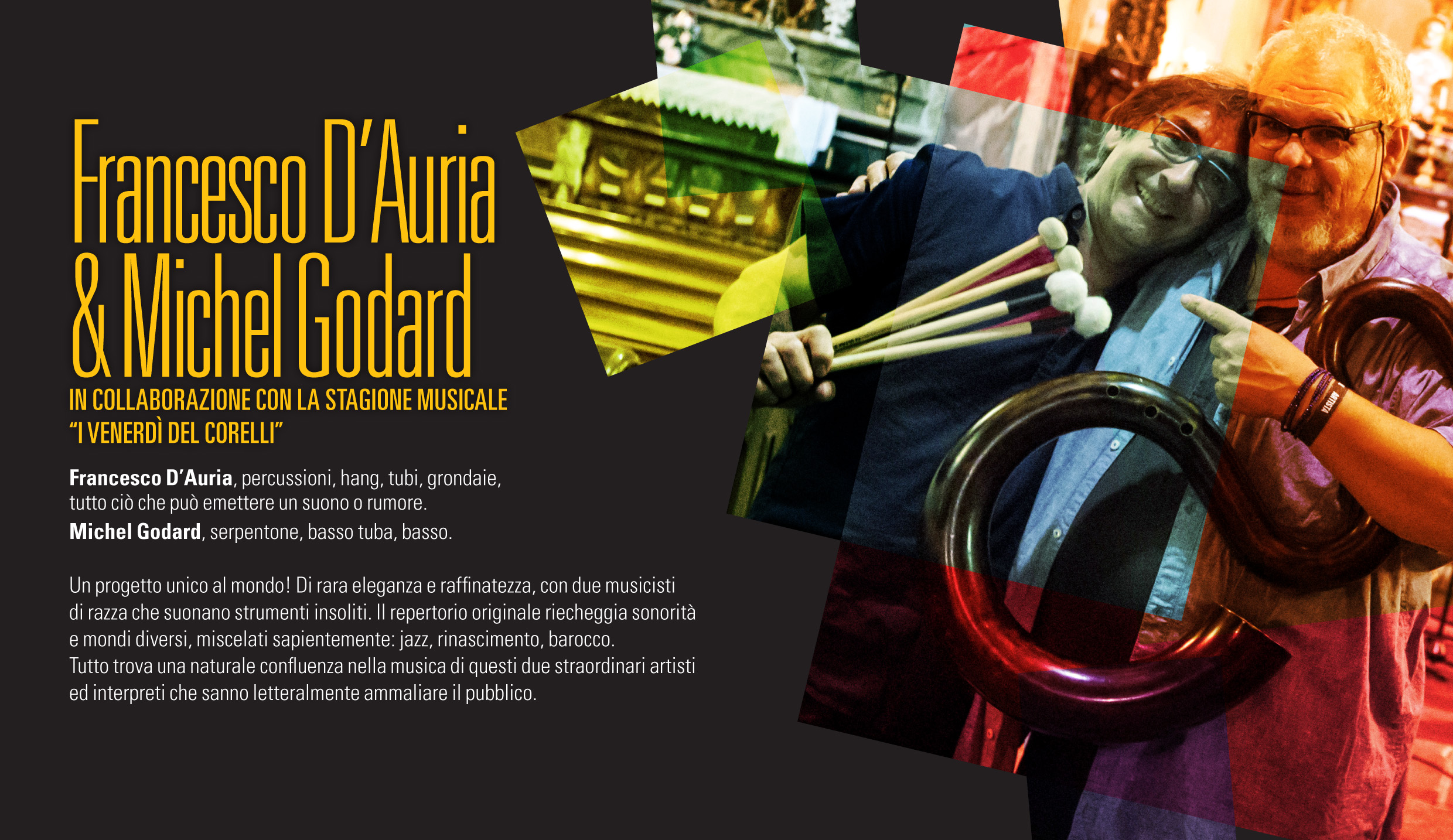 Con la collaborazione della Città di Pinerolo e dell’Istituto Musicale Corelli, Jazz Visions porta un progetto unico al mondo, di rara eleganza e raffinatezza, con due musicisti di razza che suonano strumenti insoliti. Il repertorio originale riecheggia sonorità e mondi diversi, miscelati sapientemente: jazz, rinascimento, barocco. Tutto trova una naturale confluenza nella musica di questi due straordinari artisti e interpreti che sanno letteralmente ammaliare il pubblico.
